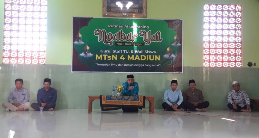 Yupz,. kali ini keluarga besar MTsN 4 Madiun mengadakan kegiatan perdana, yaitu mengaji bersama antara guru, staff TU, dan wali siswa. Kegiatan direncanakan selapan sekali dengan mendatangkan pemateri tokoh agama di sekitar madrasah. Kegitan ini bertajuk Ngabar Yai, yaitu ngaji bareng Kyai.
